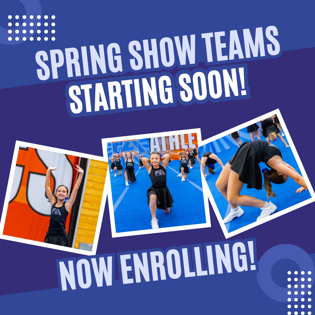 Spring Show Teams: Athletes will learn a routine and work on basic cheerleading skills including jumps, dance, and tumbling. They will practice for 8 weeks and have a performance at the end of their final practice. This program is great for kids to learn about cheer or to continue to brush up on their skills.